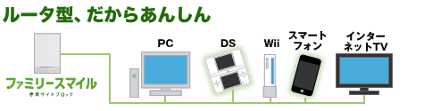 お子様が安心してインターネットを利用できる環境をお探しの方に「ファミリースマイル」はおすすめです。ルータ型のフィルタリングサービスだから、PCだけでなく、ゲーム機やスマホ、テレビなど、インターネットに接続できる家庭内すべての機器をフィルタリングの対象にできます。