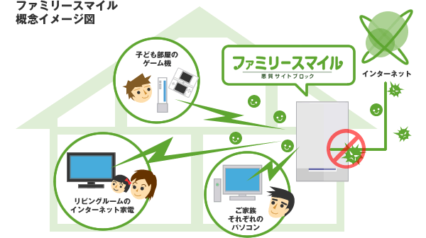 ファミリースマイルなら、インターネットの出入口「ルータ」でご家庭のインターネット機器をすべて一括管理。