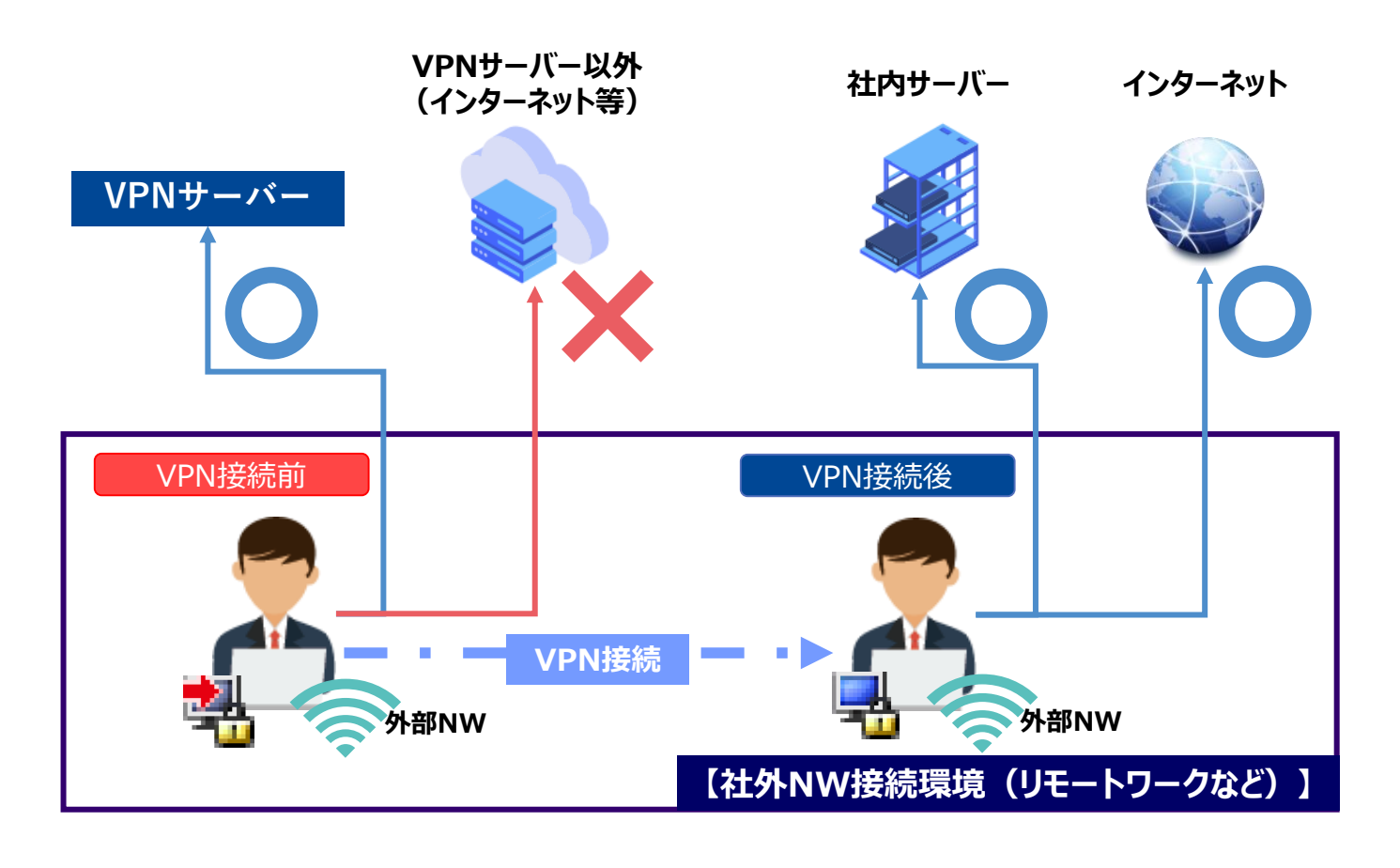 在宅勤務や外出・出張など、社外でPCを利用する際に、自社のVPNサーバー以外への接続を禁止することでVPN利用を強制します。社内ネットワーク接続時/非接続時それぞれでポリシーは自動的に切り替わるため、社内では自社が許可したアクセスポイントのみ利用させ、社外ではVPN利用を強制することで、テレワーク環境での安全なネットワーク利用を実現します。