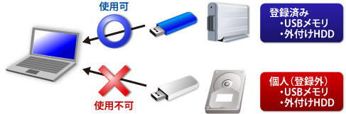 予め登録したUSBメモリ/HDDにのみ書出しを許可にし、個人で持ち込んだUSBメモリ/HDDを使わせない運用が可能です。