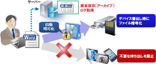 USBメモリや外付けHDDに書出す際に、ファイルを自動的に暗号化することで持出し後の漏洩対策が可能です。またファイルのアーカイブ、書出しログも取得。