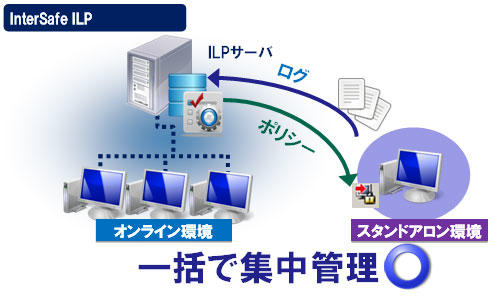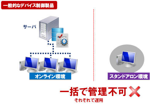 サーバーに接続不可能な環境(スタンドアロン)にあるPCに対してもクライアントソフトを導入し、サーバーに接続している PCと同じように、ポリシー適用/ログ収集が可能です。一般的なデバイス制御製品はオンライン環境とスタンドアロン環境を一括管理することはできません。