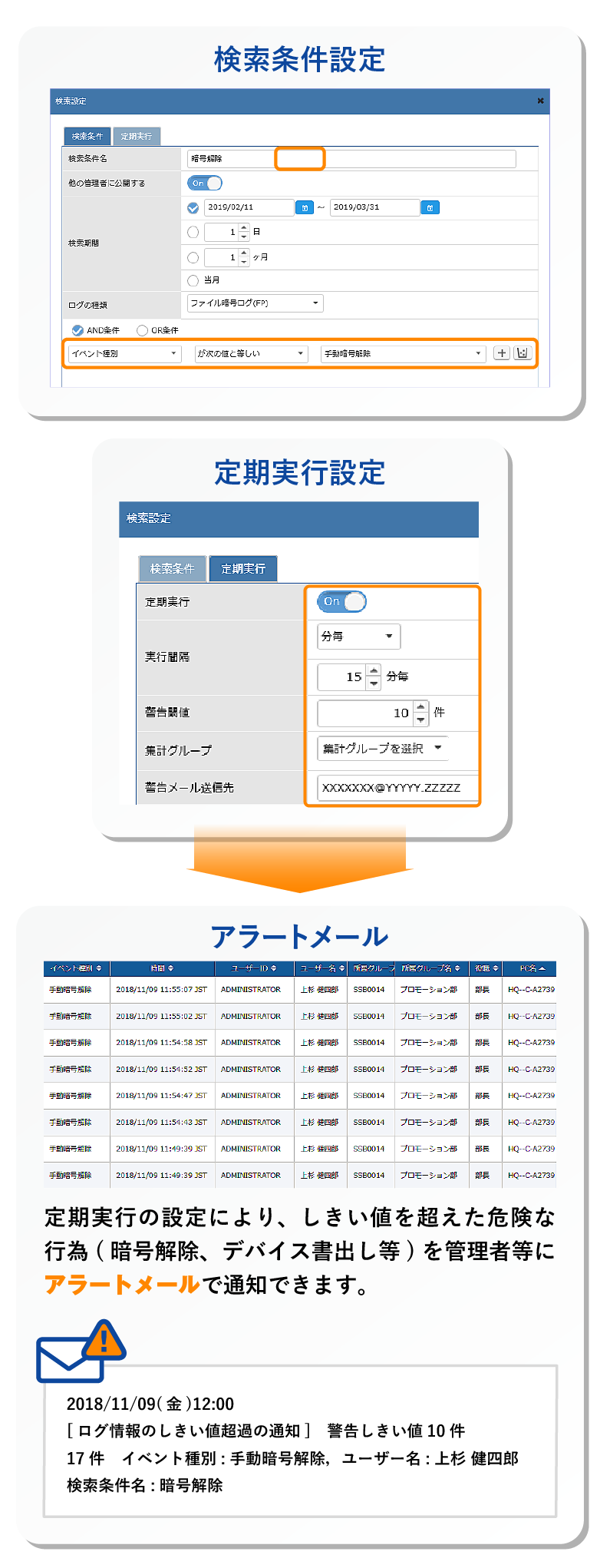 よく閲覧するログ検索条件を登録し、検索を効率的に実施できます。 また、定期実行機能により、大量ファイルの暗号解除やUSBメモリへの書出しなどの危険な操作を管理者に自動通知することで、内部不正を監視・抑止します。