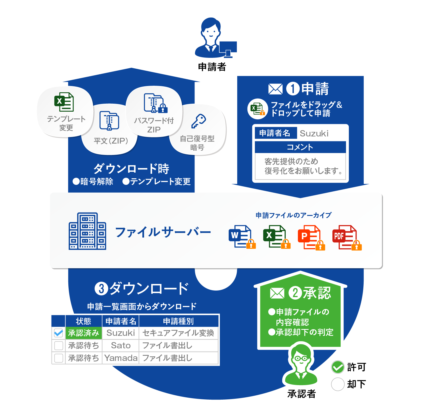 申請・承認を経て、許可されたファイルのみ書出すことが可能です。申請されたファイルは、サーバーにアーカイブされます。承認者はファイルの中身を確認した上で承認、却下を判断することが可能です。