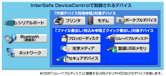 InterSafe DeviceControlで制御される多彩なデバイスの中で、外部デバイスとして利用頻度の高いものや、ファイル書出し/持込みデバイスで利用されるデバイスを本システムでシステム管理者の手を煩わすことなく、自動運用可能です。