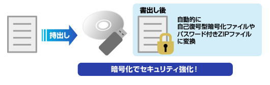 承認されたファイルをリムーバブルディスクなどに保存するタイミングで自動的に自己復号型暗号化ファイルやパスワード付きZIPファイルに変換。持出し後のセキュリティを 強化します。