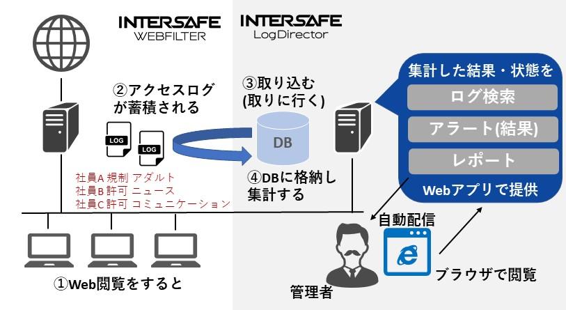 InterSafe WebFilterから取り込んだアクセスログを簡単操作で閲覧・分析することができるログ分析ソフトです。組織内の誰が、いつ、どんなサイトで、何を行ったのかを明らかにし、アクセスマネージメントの改善や問題行動の調査に役立てることができます。