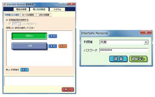 独自の認証機能で複数ユーザの切り替えが可能です。これにより、1台のPCでこどもや親のルールを簡単に切り替えることができます。また、一定時間を過ぎると使用ユーザを確認する認証画面が表示されるため、親がPC放置して席を離れたような場合でも、こどもが使用してしまうようなことはありません。