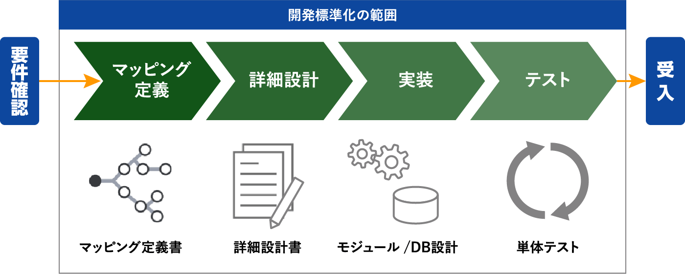 開発モジュール以外にマッピング定義等、 弊社の開発ノウハウが凝縮されたドキュメントも提供いたします。 開発範囲としては、共通部品から各種開発要件へ対応が可能です。