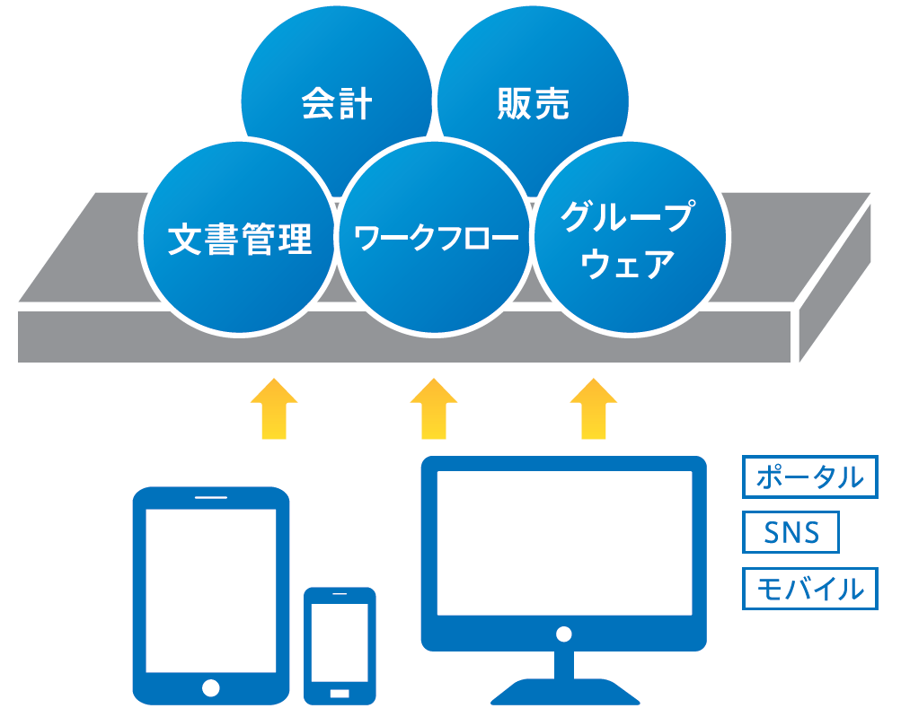 ユーザビリティの高いポータルやソーシャル機能により、社内はもちろん顧客や取引先とのコミュニケーションを促進します。また、情報系から基幹系までの各種アプリケーションは、同一基盤上で動作するため、統一したユーザインターフェース、スピーディで流れるような操作感、組み合わ せてご利用いただくことで業務効率も上がり、組織全体の生産性を向上し、ビジネスへの効果をも たらします。
