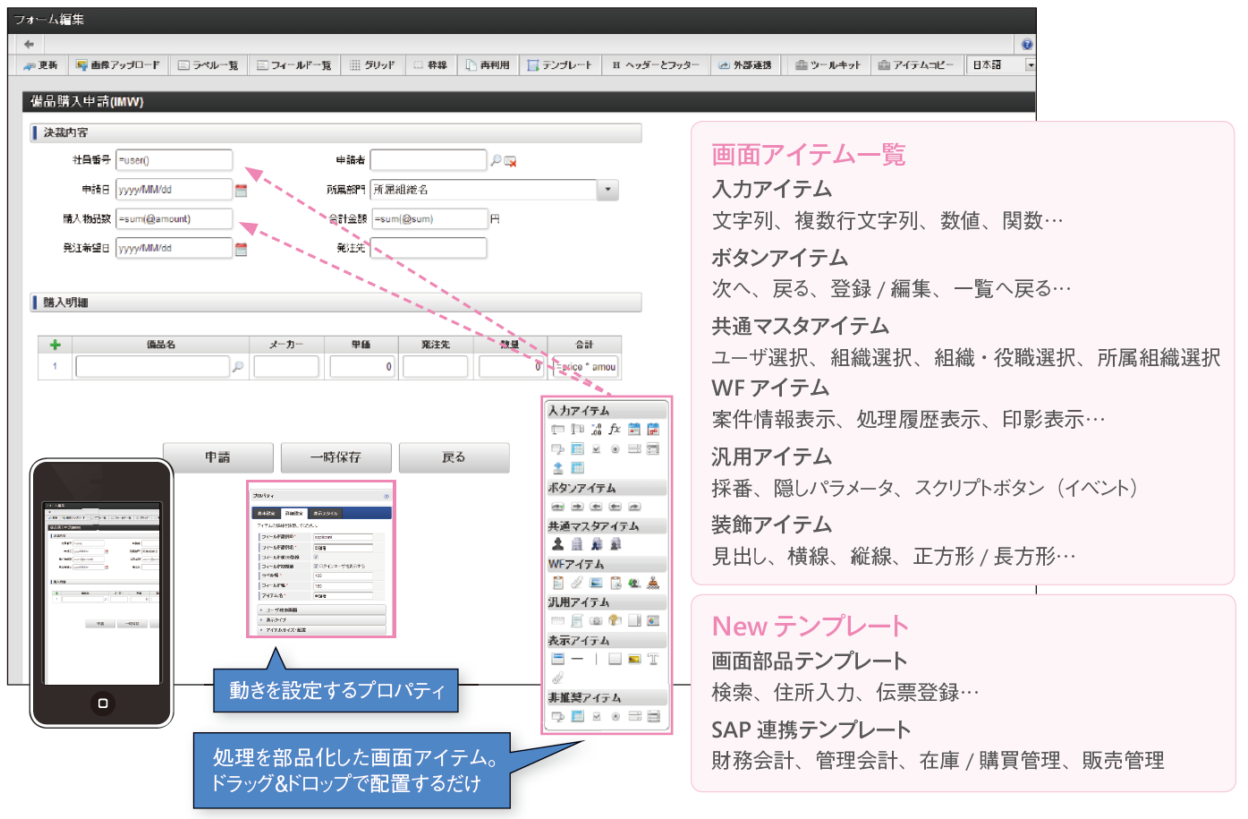 IM-FormaDesigner とは、システム共通基盤intra-mart 上で動作し、ブラウザ上の簡単な操作のみでWeb 画面フォームを作成することができるツールです。作成された画面はPC やスマートフォン、タブレットなど様々なデバイス上で動作することが可能です。グローバル展開する企業の要 請に応え、クラウド環境(Web ブラウザオンリーで作成・運用)が可能なほか、多国語にも対応。ワ ークフローとの連携も可能です。