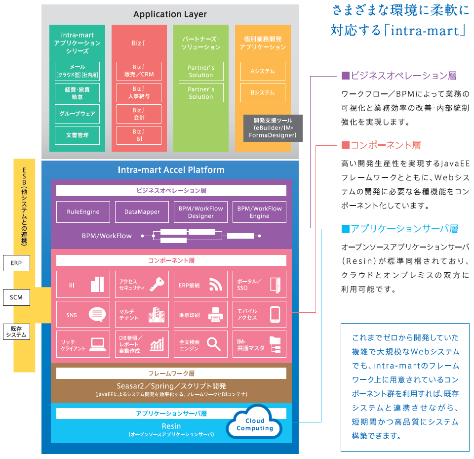 intra-mart とは、お客様のビジネスを加速させるための開発ツール、ビジネスフロー、ワークフロ ー、外部システム連携など、各種機能を統合したトータルプラットフォームです。
